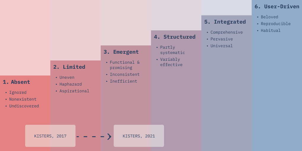 Looking at the Norman Nielsen stages of corporate UX maturity, our starting point was somewhere between stages 1-2 (Hostility towards usability/developer centred user experience). To bring us forward to a point where great usability is integral to KISTERS products, I needed to start two jobs: building trust within the team and defining a first iteration of the design process. The first step in building trust involved showing the development team that their jobs would be made easier. I started with building a design system that could be used out of the box, both by myself as a sketch library and by the developers as dojo components. Building this design system had the immediate effect of improving the styling of our products and creating more consistency within the product portfolio, with a minimum of work for the developers. In addition to creating a design system, I made sure to collect feedback not only from product owners but also from developers from the start. This approach allowed me to implement an iterative design approach and showed the development team that design decisions also took the technical feasibility of the solution into consideration. Not only was I able to build up trust within the development team, but I was also able to quickly learn what effect design decisions would have on development time with our framework.
